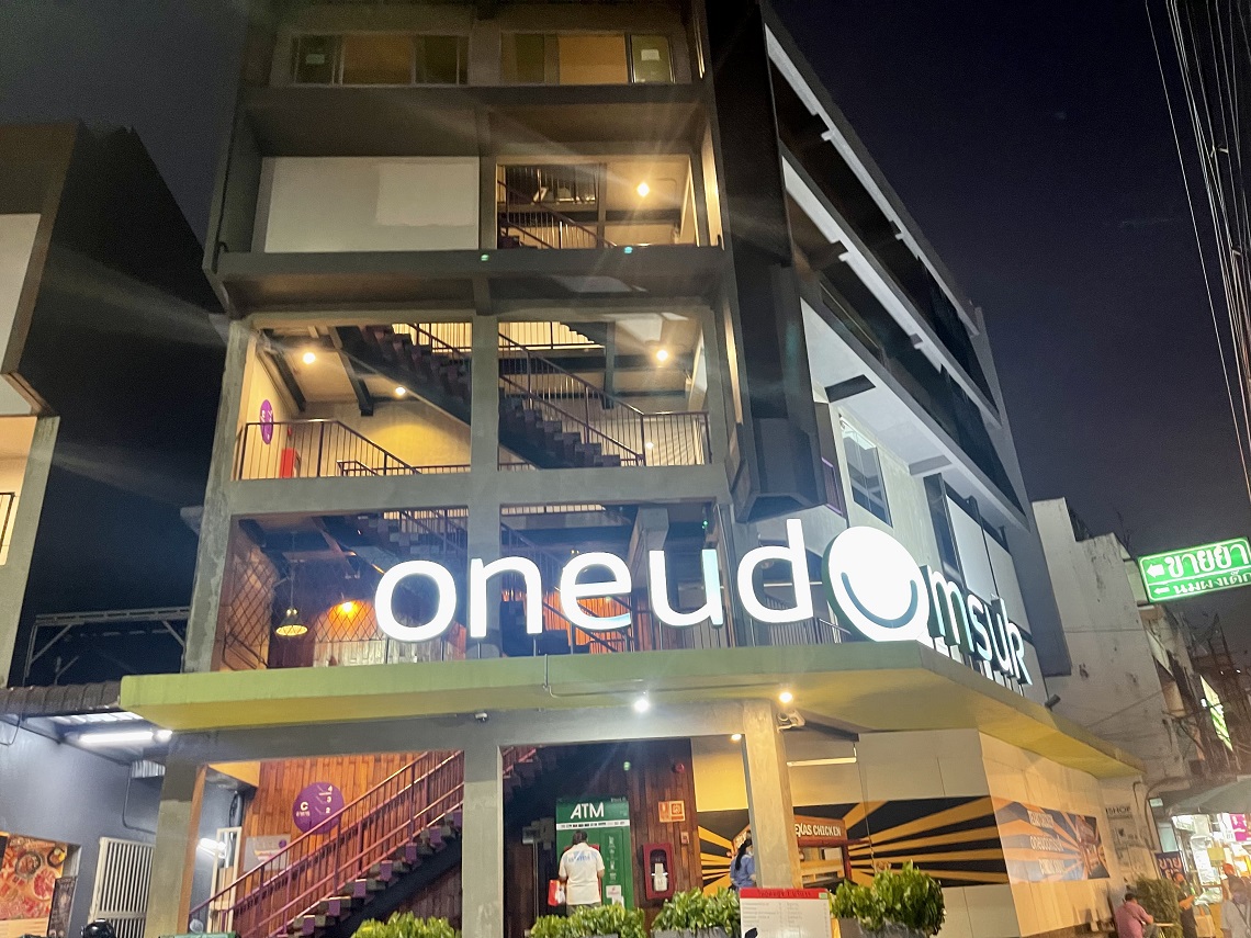 เอาล่ะ เรามาเดินสำรวจตั้งต้นถนนที่ติดกับสถานีรถไฟฟ้า BTS อุดมสุขกันซึ่งพอลงมากจากรถไฟฟ้าแล้วก็เจอกับคอมมิวนิตี้มอลล์อย่าง oneudomsuk ที่รวบรวมรวงร้านต่างๆ เป็นจุดนัดพบกับเพื่อนได้เลย ที่นี่มีครบหมด ไม่ว่าจะเป็นร้านอาหาร ร้านยา ร้านทำผม คลินิค ฟิตเนส คาเฟ่ อื่น ๆ อีกมากมาย