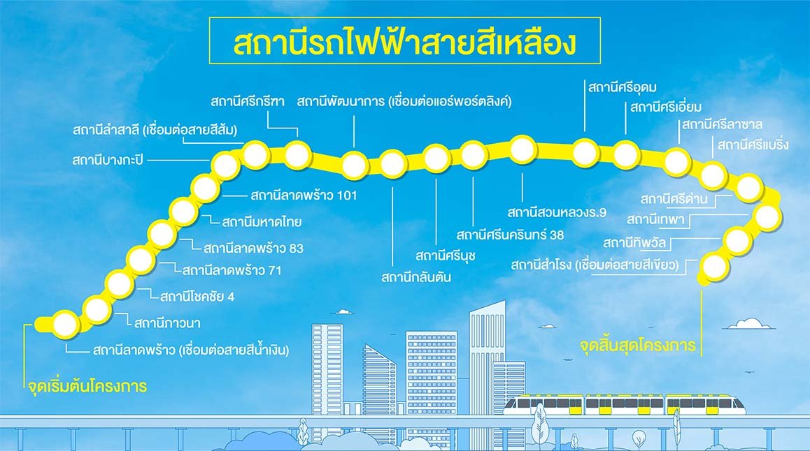 รถไฟฟ้าสายสีเหลือง เชื่อมต่อชีวิต ธุรกิจ ชุมชน คนเมือง และแหล่งกิจกรรม ซึ่งจะเห็นได้ว่าในส่วนของระยะทาง และเส้นทางการวิ่งผ่านจุดสำคัญในหลายๆ ที่ ทำให้การใช้ชีวิตของคนแถบชานเมืองง่ายมากยิ่งขึ้น อีกทั้งเมื่อไม่นานมานี้ ได้มีการทดสอบวิ่งรถไฟฟ้า โดยตัดตอนระยะทางทดสอบเพียง 6 กิโลเมตรผ่านไปยัง 5 สถานี ประกอบด้วย “สถานีศรีเอี่ยม-สถานีศรีอุดม-สถานีสวนหลวง ร.9-สถานีศรีนครินทร์ 38-สถานีศรีนุช” โดยคาดการณ์จะมีการเปิดให้บริการวิ่งในกลางปี 2565
